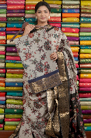 Maheswari Silk Kalamkari Design Light Grey With Navy Blue Saree