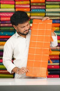 Mal Chanderi Checks With Rudraksha Butti Bright Orange With Purple Saree