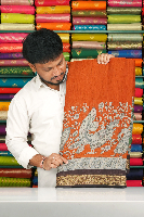 Malai Georgette Peacock Kalamkari Print Rust Orange With Chocolate Saree