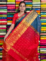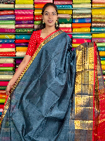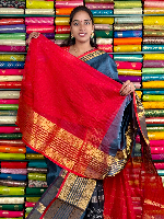 Mangalagiri Pattu Gold Zari Border Dark Grey With Red Saree