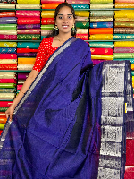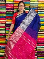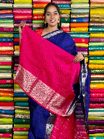 Mangalagiri Pattu Silver Zari Border Navy Blue With Pink Saree