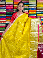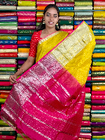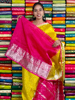 Mangalagiri Pattu Silver Zari Border Vertical Lines Yellow With Pink Saree