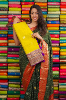 Mashru Silk Kanchi Border And Checks Butti Yellow With Purple Saree