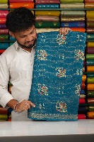 Mat Georgette Check With Gold Zari Elephant Print Rama Green Saree