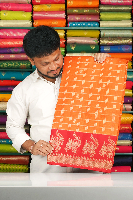 Munga Crepe Silk Checks Mango Butti Peacock Border Bright Orange With Pink Saree