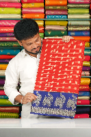Munga Crepe Silk Checks Mango Butti Peacock Border Red With Dark Navy Blue Saree