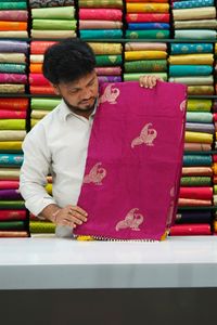 Munga Crepe Silk Double Peacock Butti Bright Magenta Pink With Yellow Saree
