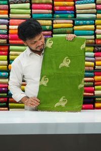 Munga Crepe Silk Double Peacock Butti Mehandi Green With Red Saree