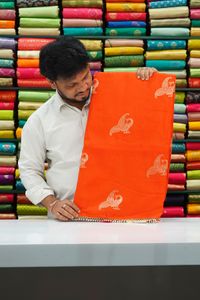 Munga Crepe Silk Double Peacock Butti Orange With Pink Saree