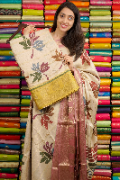 Munga Silk Floral Digital Print Beige With Yellow Saree