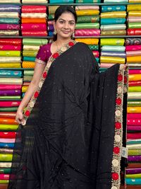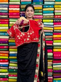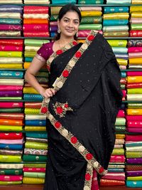 Pure Crepe Handmade Floral And Pals Work Black With Red Saree