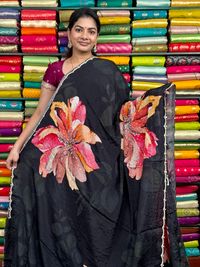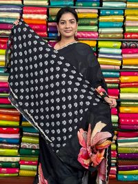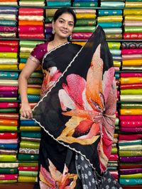 Pure Crepe Handmade Flower Digital Printed With Pal Work Black Saree