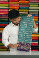 Russian Crepe Silk checks Flower Butti Teal Blue With Purple Saree