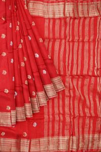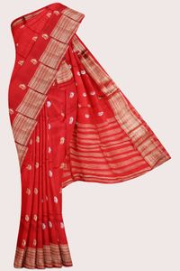Russian Crepe Silk Silver And Gold Zari Weaving And Butti Red Saree