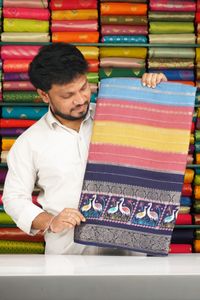 Semi Dola Silk Doriya Weaving Zari Border Multi Colour With Navy Blue Saree