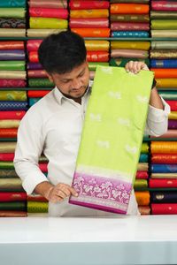 Semi Satin Silk Lotus And Leaf Butti Meena Work Parrot Green With Dark Purple Saree
