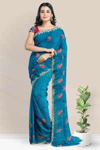 Shimmer Chiffon Embroidery Work Rama Green With Red Saree