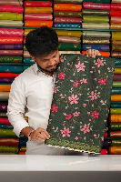 Silk Kota Floral Digital Print With Mirror Work Dark Bottle Green Saree