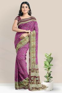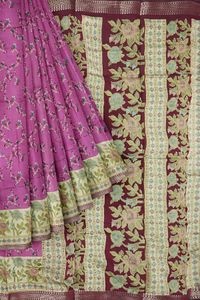 Soft Semi Chanderi Silk And Floral Design Bright Pink With Wine Saree