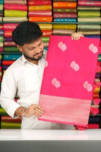 Soft Banarasi Silk Silver And Gold Zari Double Leaf Butti Bright Pink Saree