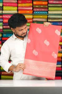 Soft Banarasi Silk Silver And Gold Zari Double Leaf Butti Peach Pink Saree