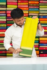 Soft Benny Crepe Plain With Double Border Lemon Yellow With Dark Green Saree