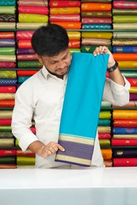 Soft Benny Crepe Plain With Double Border Rama Green With Blue Saree