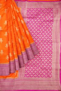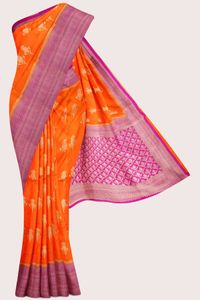 Soft Bhagalpuri Jute Silk Zari Weaving Flower Butti Bright Orange With Pink Saree