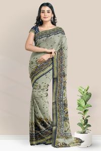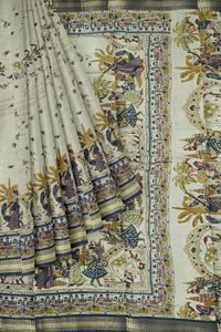 Soft Chanderi Silk Full Jal Printed Design Wheat With Navy Blue Saree