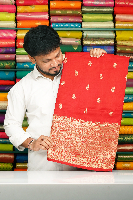 Soft Crepe Georgette Silk Gold Zari Leaf Butti Red Saree