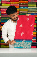 Soft Crepe Silk Emboose Digital Print Zari Border Dark Pink With Rama Green Saree