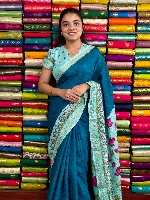 Soft Crushed Silk Digital Print Border Peacock Blue With Teal Blue Saree