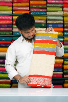 Soft Emboose Georgette Doriya Lines Cream With Red Saree