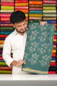 Soft Emboose Georgette Floral Digital Print Kadi Border Dark Teal Green Saree