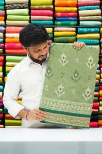 Soft Emboose Silk And Ikkath Print Teal Green With Dark Green Saree