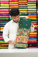 Soft Emboose Silk Printed Pattern Flower Butti Dark Green Saree