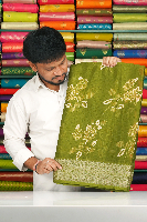 Soft Emboose Silk Rose Digital Print Floral Border Mehandi Green Saree