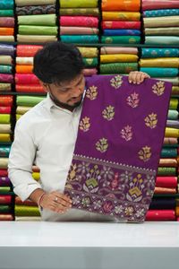 Soft Ikkath Floral Design With Meenakari Work Brinjal Saree