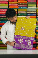 Soft Jute Silk Doriya Line Peacock Print Lemon Yellow With Purple Saree
