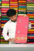 Soft Jute Silk Doriya Weaving Kalamkari Peacock Print Bright Pink With Navy Blue Saree