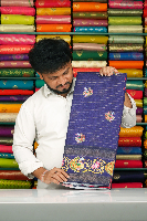 Soft Jute Silk Doriya Weaving Kalamkari Peacock Print Navy Blue With Peach Saree