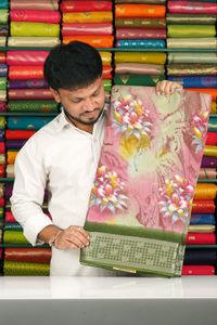 Soft Jute Silk Floral Digital Print Kanchi Border Pink And Mehandi Green Mix Saree
