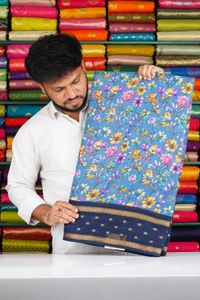 Soft Jute Silk Gap Border Floral Digital Print Light Blue With Dark Navy Blue Saree