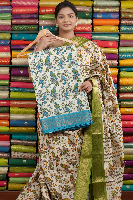 Soft Jute Silk Ikath Print Half White With Sky Blue Saree