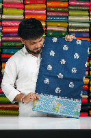 Soft Jute Silk Silver Zari Flower Butti Peacock Blue With Teal Blue Saree