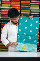 Soft Jute Silk Silver Zari Flower Butti Rama Green With Light Blue Saree