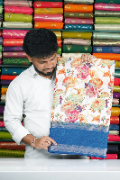 Soft Jute Tussar Silk Floral Digital Print Half White With Royal Blue Saree