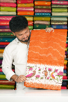 Soft Jute Tussar Silk Gold Zari Checks Bright Orange With Cream Saree