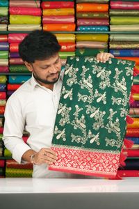 Soft Kathan Silk Jangla Work Design Dark Bottle Green With Red Saree