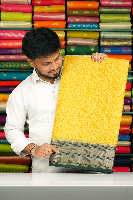Soft Kora Silk Fancy Print With Zari Border Yellow With Bottle Green Saree